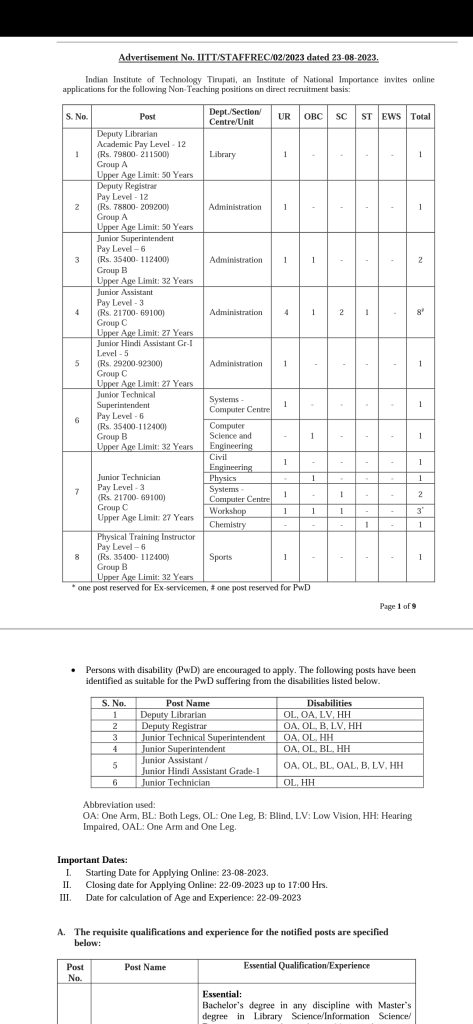 II. Closing date for Applying Online: 22-09-2023 up to 17:00 Hrs.III. Date for calculation of Age and Experience: